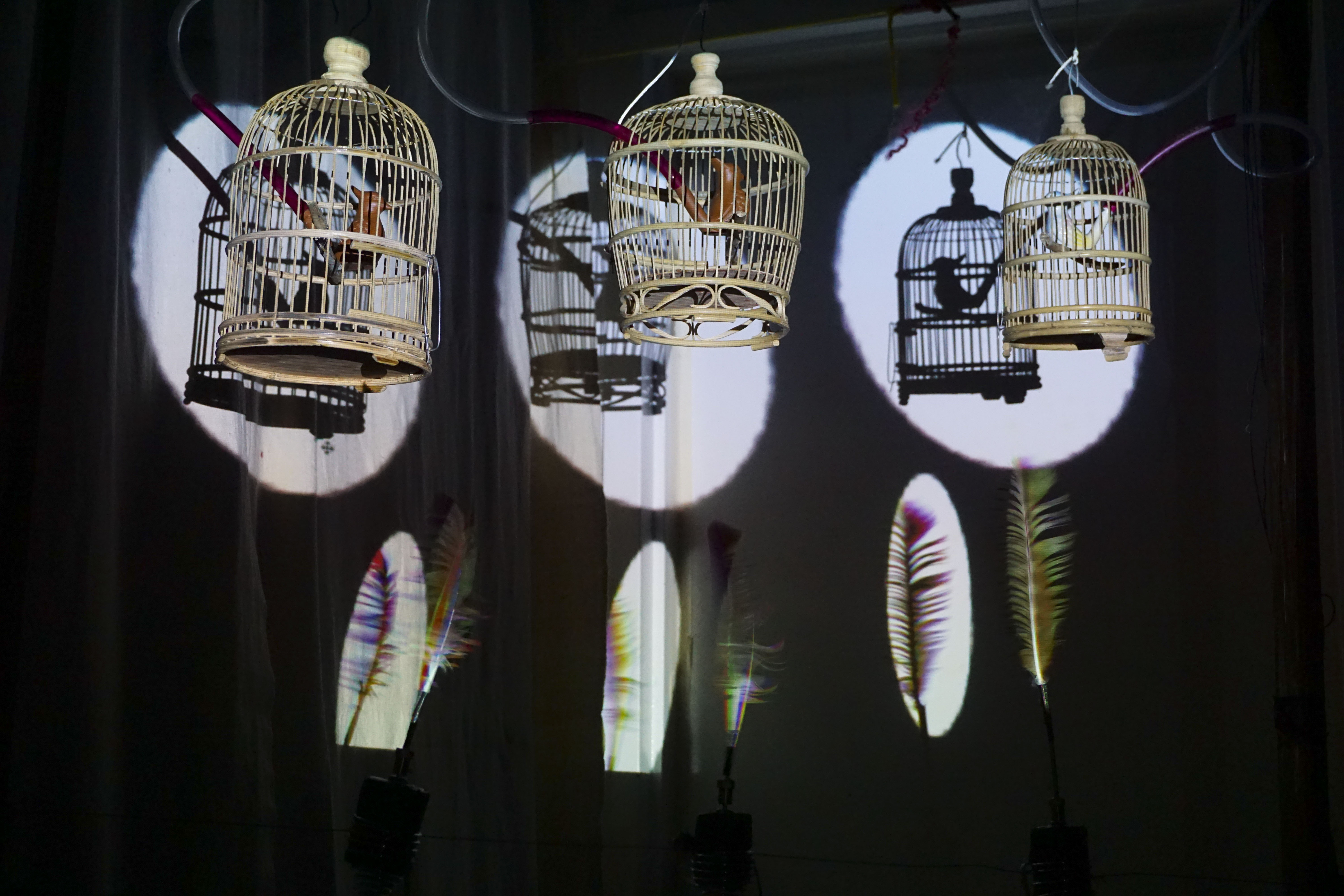 This work plays with projection/screen, human/non-human, and analogue/digital. Things are not black and white. The birds too can dance around and reveal the colours of our projection.